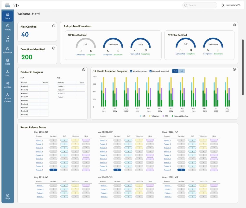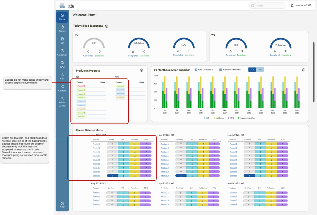 Additionally, business heads who heavily utilize the dashboard find that the home dashboard displays key data with minimal visual cues, leading to difficulty understanding completion statuses across months, products, and sub-products due to a lack of visual hierarchy, color-coded feedback, and contextual cues. Users want to adopt pre-attentive processing and visual chunking to easily spot statuses based on product lines. This will also promote Gestalt principles of proximity and similarity from visual grouping and style layouts.