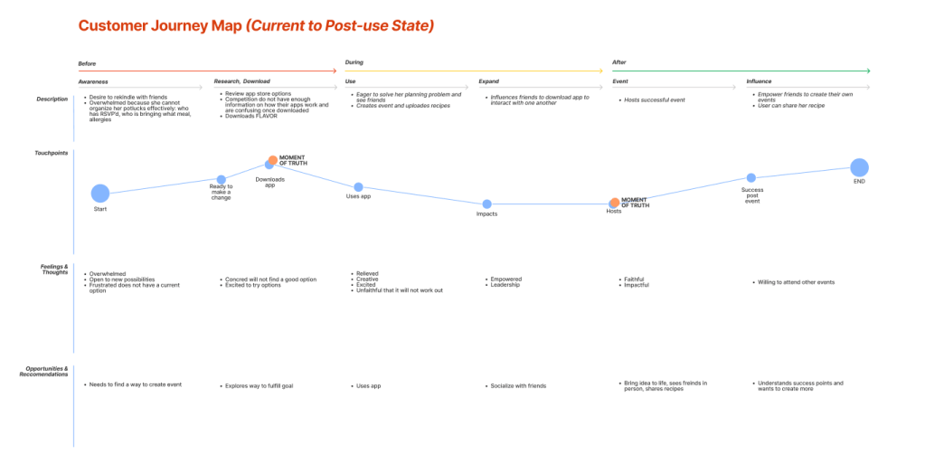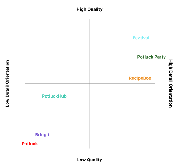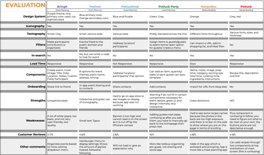 Then, I conducted a competitor analysis on the direct competition. I navigated the features to determine commonalities and gaps. I then audited recipe-building applications to address the needs of the recipe feature of FLAVOR. After, I created a preliminary draft to outline the business objectives, desired user outcomes, and intended personas to target.