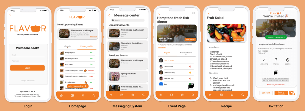 Solution: FLAVOR streamlines the efficiency and organizational efforts around event planning and socializing. It allows users to share their allergies, ask questions in a chatroom feature, save recipes, and make new friends.