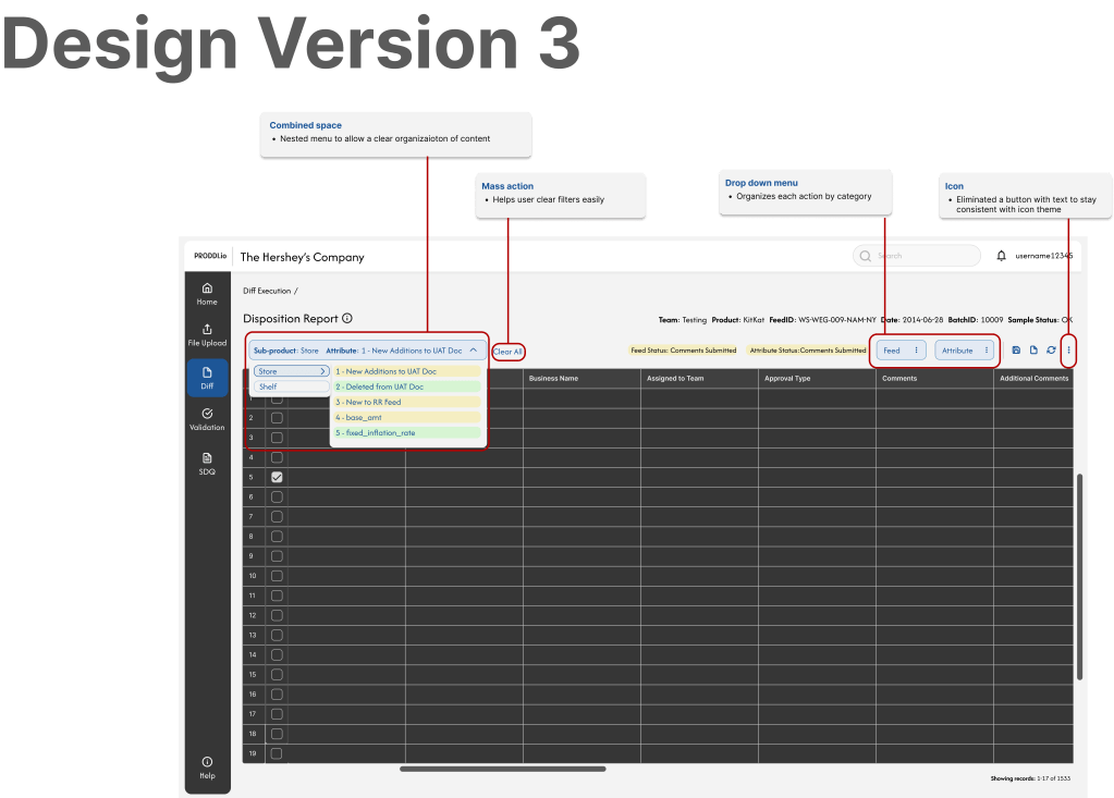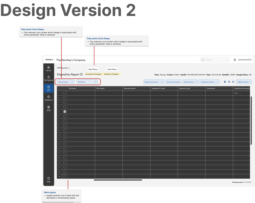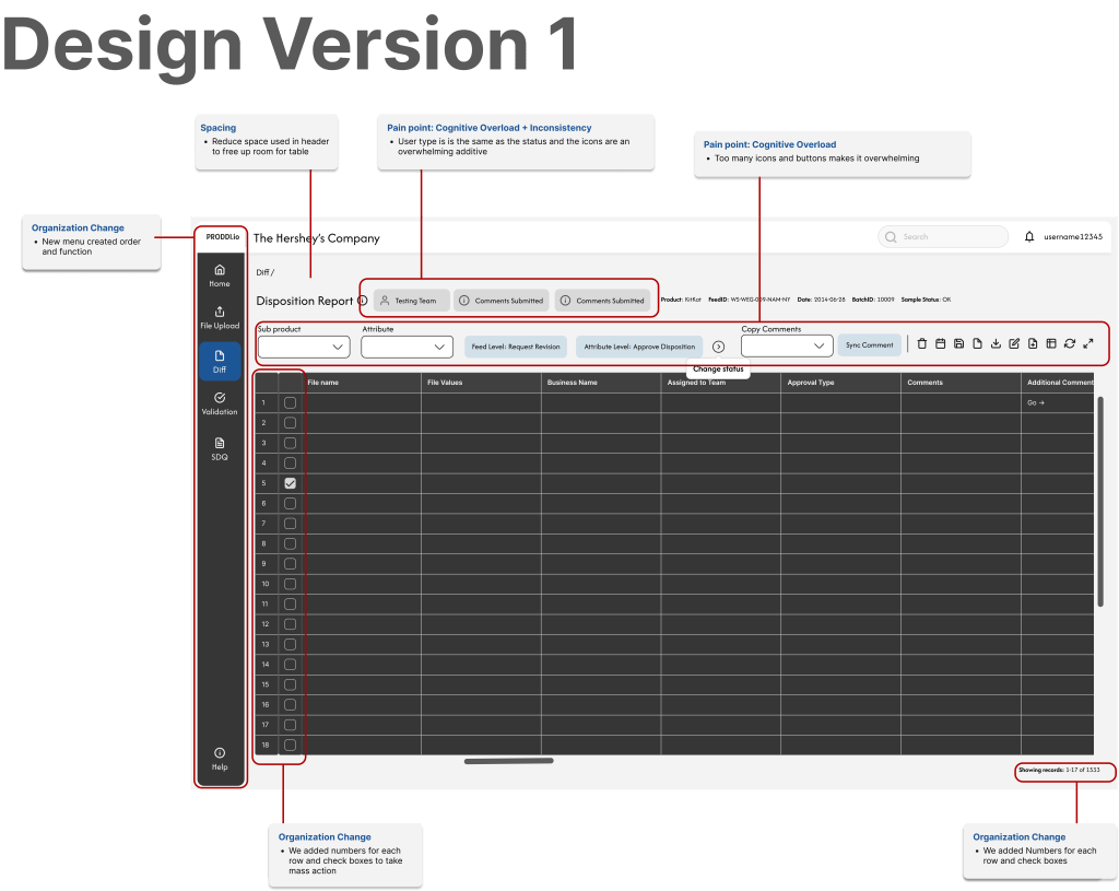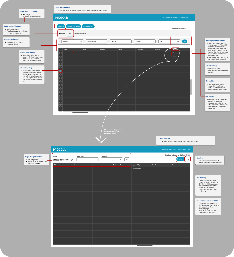 Users of the PRODDI platform face significant cognitive overload on the Disposition page during the Diff process because of complex and unclear navigation, poor hierarchy, too may external third party platforms to record work, confusion on how to report completed work back into the system, and lack of real-time feedback. This creates friction in identifying relevant changes related to new features, bug fixes, and code modifications, slowing down data validation and UAT readiness. We need to streamline the review process to enhance data quality assessments and decrease downtime by at least 75%.