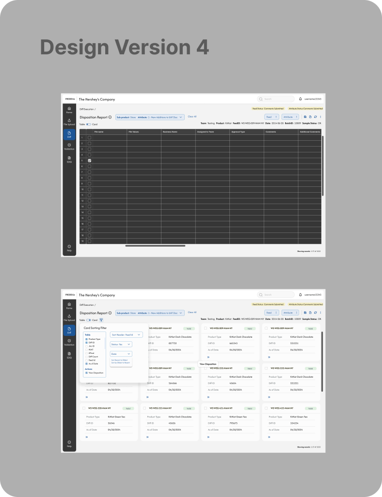 Our second design audit focused on reducing steps and adding more space to visualize the table. Our third design audit created a nested menu to reduce space, added segmented buttons for certain actions associated with specific steps, and freed up space to reduce cognitive overload. Finally, our last audit was adding a variability toggle to the design to give users the options of viewing the table in a card view. The goal of this is to help users process chunks of information easily and reduce eye movement and cognitive fatigue from scanning table columns and rows.
